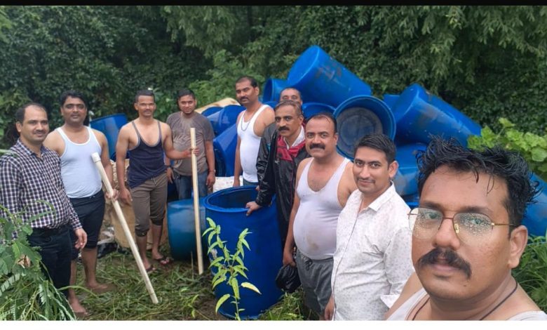 दिवा, दि.२८ :- गणेश नगर, दिवा पूर्व खाडी पट्ट्यात अवैध गावठी हातभट्टी गाळप केंद्र सुरू असल्याची गोपनीय माहिती प्राप्त झाली होती. त्यावरून दिवा पोलीस चौकी येथील सपोनि वसंत खतेले, सपोनि अमोल कोळेकर, सपोनि राजेंद्र तोरडमल, पोउपनि सुभाष मोरे, पोलीस अंमलदार गोविंद मुंढे, जयेश तामोरे, महेश जाधव, वसीम तडवी, निळकंठ लोंढे यांचेसह गणेशनगर-आगासन दिवा पूर्व यादरम्यानचे खाडी परिसरात पंचांसह जाऊन पाहणी केली असता, गणेश नगर खाडीपट्ट्यातील दलदलीमध्ये गावठी हातभट्टी गाळप कारखाना व 200 ड्रम दारू बनविण्याचे रसायन (3600 लिटर) मिळून आले. याबाबत इ साक्ष एप्लीकेशन मध्ये व्हिडिओ ग्राफी करून व सविस्तर पंचनामा करून गावठी हातभट्टी गाळप कारखाना, दोनशे ड्रम आणि त्यामधील दारू निर्मितीचे रसायन जागीच नष्ट करण्यात आले आहे.